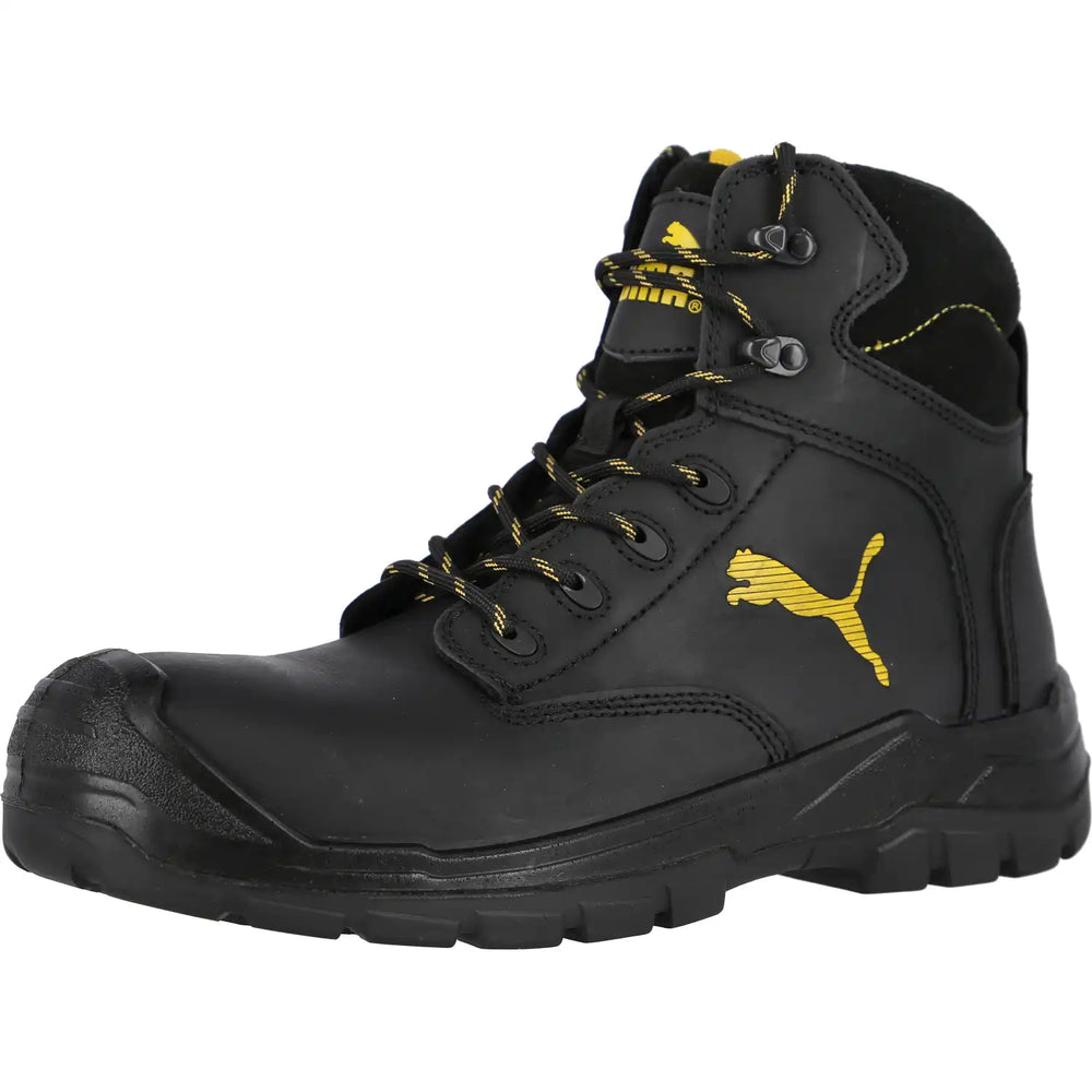 Sicherheitshochschuhe "BORNEO BLACK MID" von PUMA bieten optimalen Schutz und Komfort für anspruchsvolle Arbeitstage im Gelände. Gefertigt aus Vollrind-Glattleder mit abriebfesten Textil-Verstärkungen, verfügen sie über ein BreathActive-Funktionsfutter zur Feuchtigkeitsregulierung. Die Nitrilgummi-Laufsohle mit grobstolligem Profil sorgt für sicheren Halt auf allen Untergründen. Eine dämpfende PU-Zwischensohle mit EVER.FLEX-Element und die evercomfort-Einlegesohle bieten zusätzlichen Komfort. Die Fiberglas-Zehenschutzkappe und der Federstahl-Durchtrittschutz gewährleisten Sicherheit. Der VOLUME PLUS-Leisten bietet mehr Zehenfreiheit. Zugelassen für orthopädische Einlagen gemäß DGUV 112-191. Sicherheitsklasse S3 WR HRO SRC.